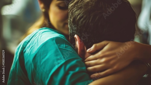 woman, man, teal, shirt, hugs, arm, hand, finger, back, head, neck, hair, love, affection, intimacy, human relationships, togetherness, care, support, comfort, tenderness, connection, closeness, warmth, emotional, romantic, couple, partner, gentle, loving, intimate, passion, desire, trust, security, hug, soft, smooth, skin, portrait, photo, emotion, feeling, human, gesture