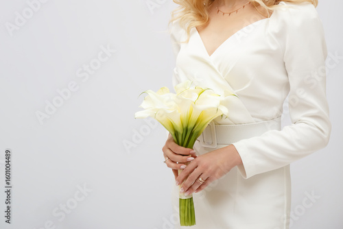 A woman in a white dress holding a bouquet of white calla lilies against a white background studio shot