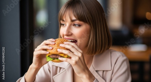 woman, burger, eating, food, delicious, meal, eatery, cafes, bite, hamburger, cheeseburger, cheese, lettuce, beef, happy, enjoying, face, mouth, appetence, lunch, dinner, fast food, lifestyle, casual attire, healthy, unhealthy, portrait, young, adult, cheerful, hair, brown hair, finger, hand, closeup, indoor, daylight, natural light, window, outdoors, blurred background, beanie, coat, brunette, fresh, ravenous, satisfied, expression