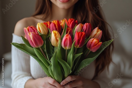 A woman is holding tulips in her hands, she smiles and looks at the bouquet of flowers with joy. The background is light, with a bright room behind it. The photo was taken from above, and the colors a