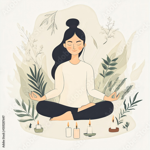 woman, sitting, lotus, position, candle, lit, peaceful, meditating, yoga, state, illustration, female, relaxation, lifestyle, pose, healthy, cartoon, health, vector, body, person, exercise, character, balance, young, zen, fitness, calm, wellness, happy, asana, flat, practice, activity, concentration, harmony, beauty, design, spiritual, calmness, background, nature, floral, energy, sport, class, posture, lady, drawing