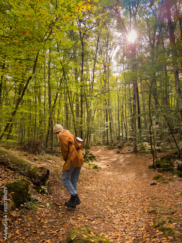 woman, holiday maker, mountain, forest, path, brown, jacket, autumn, backpack, horizontal, inviting, shining, exploration, male, person, sunshine, back, sport, freedom, lonely, misty, creating, man, recreation, standing, sunrise, outside, light, active, atmosphere, photo, young, sun, one person, adult, guy, warm, alone, lifestyle, outdoors, wood, leisure, foggy, walking, leaf, yellow, sunlight, trail, green