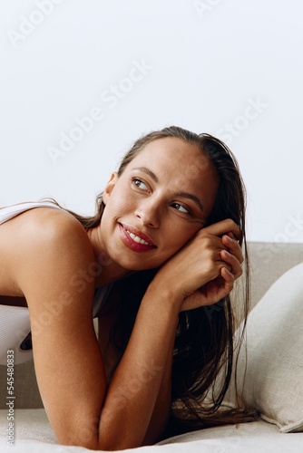 pillow, lingerie, woman, smile, couch, model, fashion, home, beauty, tanned skin, jean, smiling, skincare, female, sofa, isolated, background, white, adult, white background, attractive, beautician, beautiful, blue, reddening, care, cheekbones, clean, closeup, eye, face, fresh, girl, hair, coiffure, health, healthy, make-up, natural, natural makeup, portrait, shoulder, skin, young