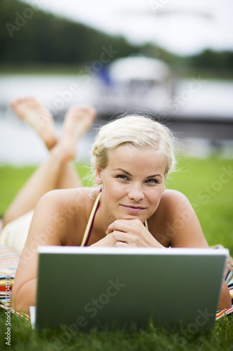 computer user, leisure, communication, people, relaxing, blond, computer, grass, woman, laptop, smiling, holiday, outdoors, lawn, resting, happy, vertical, 1, adult, day, wireless technology, adults only, lifestyle, colours, front view