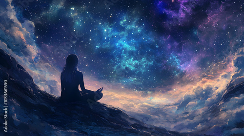A woman meditating beneath a starry sky, finding tranquility in the vastness of the universe. -