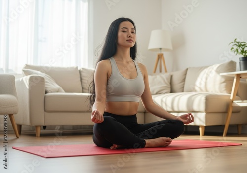 A woman meditating on a yoga mat in a bright and peaceful living room
