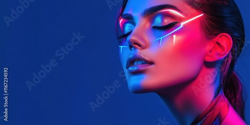 A woman poses confidently with vibrant neon makeup, her face illuminated in shades of blue and pink, showcasing unique artistic features and striking contrast