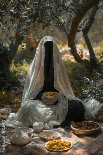 A woman sits on a blanket wearing a white veil, great for use as a symbol of purity or innocence in your projects
