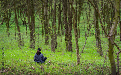 woman, forest, spring, nature, tree, sitting, serene, tranquil, peaceful, calm, wood, green, leaf, sunlight, dappled, light, shadow, young, girl, female, person, solitary, alone, contemplation, meditation, relaxation, landscape, scene, environment, park, wood, plant, grass, foliage, flora, quiet, stillness, mindfulness, botany, ecology, ecosystem, earth, ground, atmosphere, air, freshness, beauty