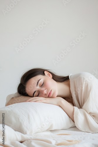 A woman sleeps peacefully on a white pillow, surrounded by a clean and neutral-toned room that promotes a sense of calm and clarity. Soft focus enhances the serene atmosphere