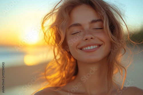 A woman stands on the beach at sunset, her hair blowing in the wind, her eyes closed in pure joy and a wide smile on her face. Generative AI