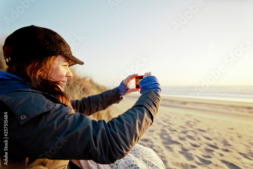 A woman takes a picture of the sunset with her smartphone while at the beach.