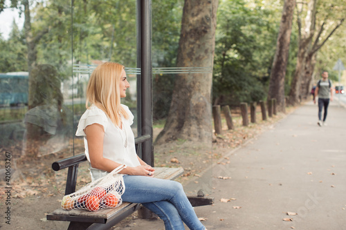 alone, blond, bus, bus stop, city, copy space, day, daylight, eco, female, fruit, looking, 1, public, station, street, summer, town, transportation, urban, waiting, woman