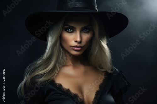 A woman wearing a black hat strikes a pose for a photograph. This image can be used for fashion, portrait, or modeling concepts