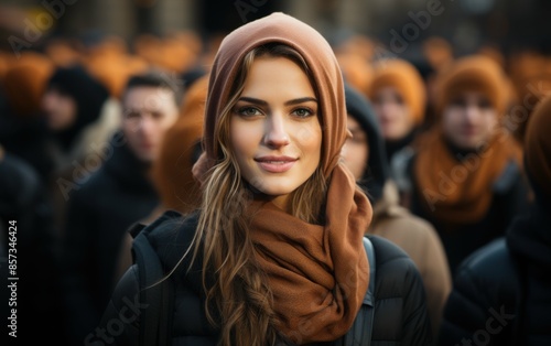 A woman wearing a brown scarf stands in front of a crowd of people. She is smiling and looking at the camera