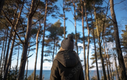 A woman wearing a coat and hat gazing up at tall pine trees in a forest, framed by a bright blue sky. Perfect for nature, adventure, and outdoor themes.