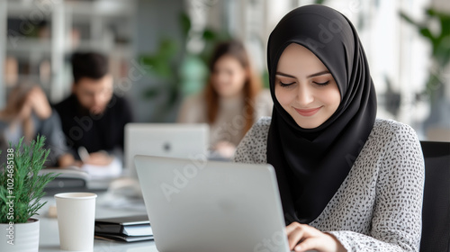 laptop, muslim, person, computer, female, beautiful, young, woman, business, attractive, sitting, businesswoman, technology, islam, arabian, lady, working, arab, adult, job, office, indoor, lifestyle, portrait, using, desk, eastern, smart, pretty, cyberspace, professional, traditional, table, workplace, confident, contraption, online, 1, modern, electronic, successful, corporate, success, notebook, communication, asian, entrepreneur, foulard