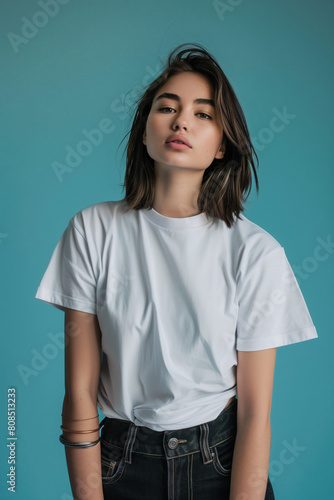 woman, person, individual, human, t-shirt, design, mock-up, blank, canvas, white, style, fashion, creative, beauty, model, face, 1, posing, casual attire, glamour, standing, looking, hair, shirt, lady, expression, cotton, t-shirt, wear, clothes, textile, garment, front, tee, top, apparel, retail, new, template, studio, jean, brunette