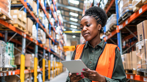A woman wearing an orange vest is standing in a warehouse and looking at a tablet. She is focused on the tablet and possibly checking inventory or receiving instructions