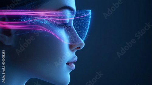 A woman wearing futuristic glasses, glowing with streaks of digital data. A representation of virtual reality and the future of technology.