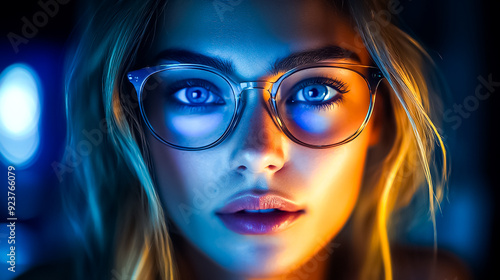 A woman wearing glasses with the reflection of a face in the mirror, portrait of a woman, portrait of a woman with painted face, portrait of a woman with a painted face