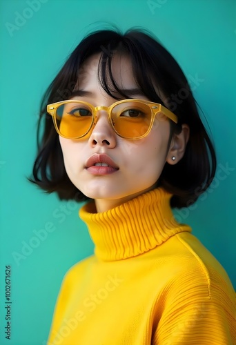 woman, wearing, yellow, goggles, sweater, smiling, portrait, fashionable, young, face, attractive, model, beauty, sunglasses, female, hair, pretty, caucasian, style, glamour, brunette, person, cute, adult, white, summer, colours, background, studio, stylish, happy, lip, bright