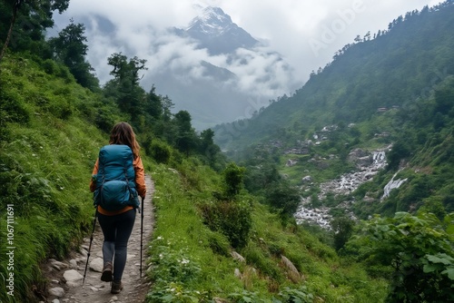 woman, backpack, walking, down, trail, mountain, fog, path, hike, hiker, hill, hillside, person, lush, mountain, stick, insect, vale, walk, mountainous, area, wearing, blue, holding, trekking, pole, made, stone, surrounded, greenery, both, side, background, range, covered, cloud, sky, overcast, mood, peaceful, serene