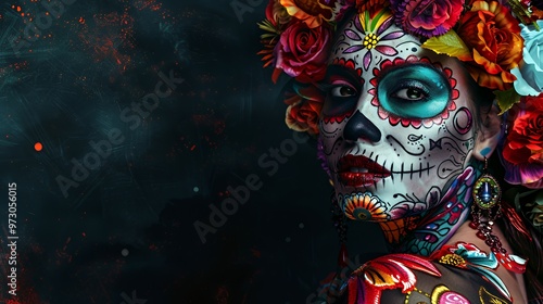 sugar, skull, make-up, floral, headdress, woman, face, eye, lipstick, art, design, costume, festival, celebration, holiday, culture, tradition, mexico, mexican, day, dead, death, halloween, scarey, skittish, colourful, bright, vibrant, black, dark, background, abstract, pattern, decoration, paint, body, graphic, illustration, model, fashion, jewellery, accessory, ornate, elegant, beautiful