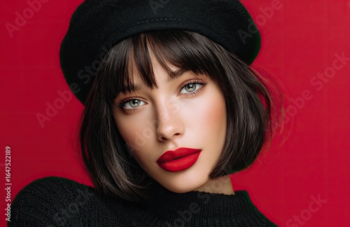 A woman with a dark bob haircut and bangs, wearing red lipstick and a beret, poses against a vibrant solid-color background