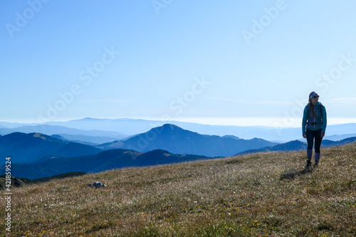 A woman with a hiking backpack hiking to the top of Hohe Weichsel in Austria. The woman in enjoying the calmness. The vast pasture is turning golden. Exploration and discovery. Endless mountain chains