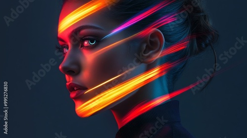 A woman with a sharp jawline and colorful light streaks playing across her face, creating a striking contrast against her modern outfit