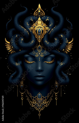 A woman with a snake headdress and gold jewelry. The woman is sleeping. The gold and blue colors give the image a mystical and exotic feel