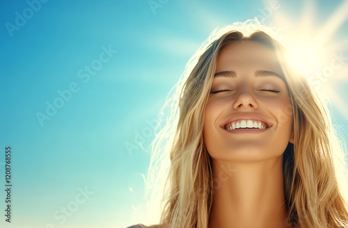 A woman with blonde hair is smiling and looking up at the sun. Concept of happiness and contentment