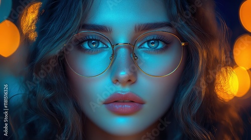 A woman with blue eyes and glasses is staring at the camera. The image has a cool, modern vibe with a blue and orange color scheme