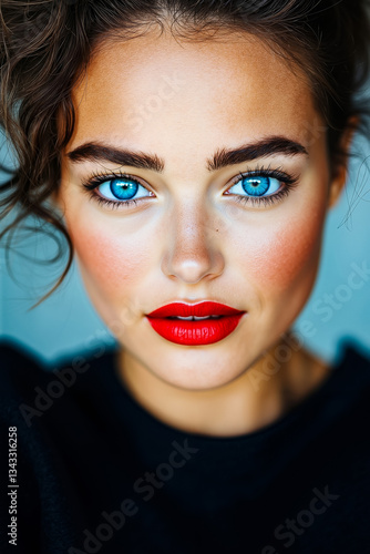 woman, blue, eye, red, lipstick, portrait, beauty, make-up, lip, hair, fashion, style, face, shot, photo, portraiture, beautiful, cosmetic, eye, eyeliner, mouth, closeup, striking, young, serious, expression, looking, camera, styled, loose, curl, fall, over, shoulder, black, top, painted, bright, background, light, colours, sharpened, lighting, soft, natural, highlighting, dramatic