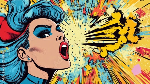 pop art, comic book, woman, female, red lips, scream, shouting, explosion, background, colourful, vibrant, illustration, art, graphic, design, vintage, retro, comic, style, abstract, pattern, line, dynamic, motion, energy, powerful, expression, character, superhero