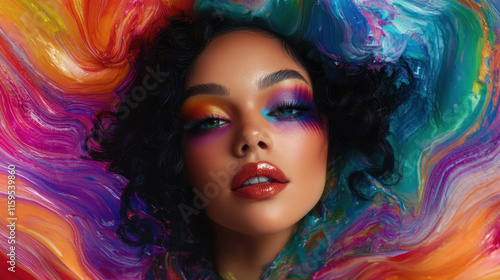 woman, portrait, make-up, vibrant, colours, beauty, swirling, creativity, hair, cosmetic, fashion, expression, bold, modelling, coiffure, studio, striking, bright, closeup, painting, expressionism, fantasy, artistry, playful, high-coloured, glamour, design, portraiture, stylish, inspiration, colourful, serene, captivating, eye makeup, lip gloss, aethereal, aesthetic, studio shot, modern art, culture, personality, illustration