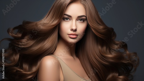A woman with brown long hair. Portrait of a young model. A beautiful girl with a face dollike shows off her hairstyle