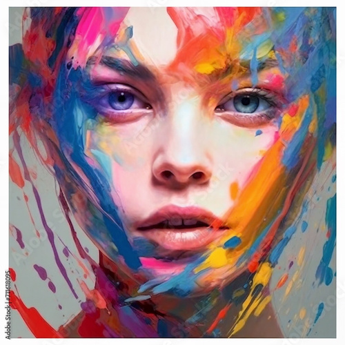 a woman with colorful makeup and a colorful face is shown in this artistic photo with a white background and a white border, generative ai
