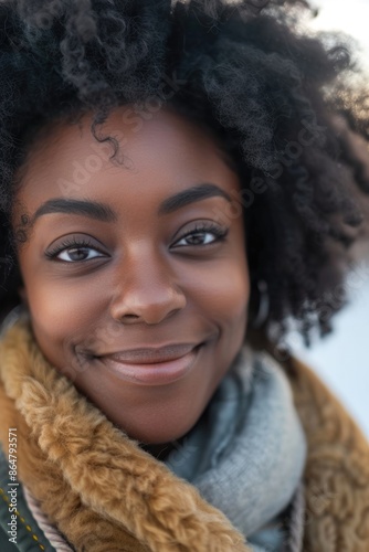 A woman with curly hair and a scarf on her neck is smiling. She has a warm and friendly expression on her face