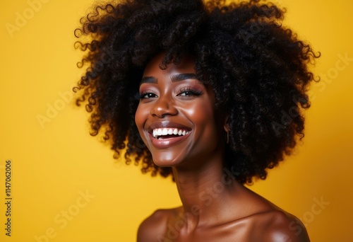 woman, female, portrait, smile, happy, joy, laughing, cheerful, beautiful, african, black, afro, curly hair, skin, face, eye, teeth, yellow background, studio, fashion, beauty, model, make-up, confident, positive, vibrant, energy, expression, emotion, human, people