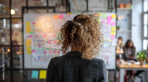 woman, curly, hair, whiteboard, sticky, note, mind, map, flowchart, business, planning, brainstorming, creative, session, idea, organisation, innovative, professional, workspace, collaboration, productive, goal, marker, writing, meeting, presentation, concept, structured, visionary, analytical, visual, design, outline, focused, thought, project, process, colourful, action, item, step, agenda, improvement, development