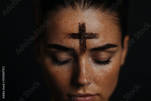 woman, cross, forehead, eyes closed, freckle, face, religion, faith, spirituality, belief, ash, holy, religious, christian, spiritual, prayer, hope, repentance, sacrifice, grace, blessing, divine, meditation, contemplation, renewal, humbleness, tradition, ceremony, rite, liturgy, symbol, mark, shape, dark, black, closeup, studio, portrait, head shot, skin, beauty, devotion, worship, peace, solemn