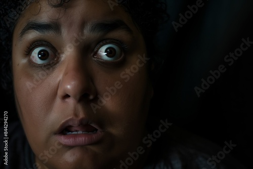 A woman with fearful expression on a dark background