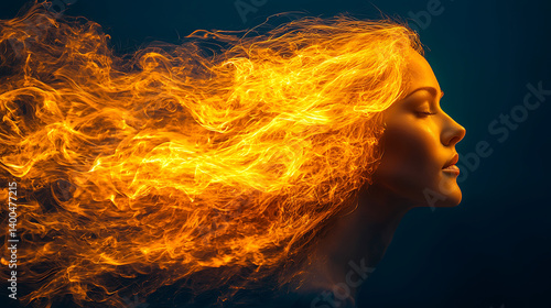woman, hair, fire, flames, hot, beauty, portrait, female, abstract, light, fantasy, energy, glow, dark, dramatic, surreal, mystic, aethereal, vibrant, imagination, creative, conceptual, design, artistic, model, profile, glowing, warm, flow, flowing, passion, power, intense, mysterious