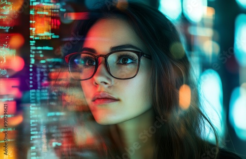 A woman with glasses is seen in front of an abstract background filled with data and code, symbolizing the field's role as both her workspace for coding.
