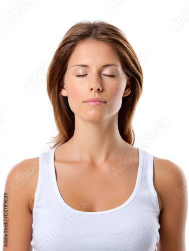 A woman with her eyes closed and lips pressed together, medium closeup, isolate on white background