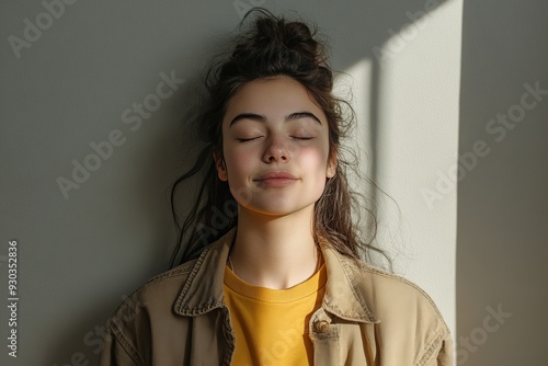 A woman with her eyes closed standing against a wall with sunlight streaming in symbolizing inner peace mindfulness and the simple joys of quiet reflection and solitude in a modern world