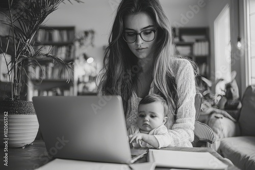female, woman, long hair, goggles, working, laptop, home, baby, motherhood, cosy, environment, balance, multitask, sharpened, technology, parenting, family, children, living room, indoor, home office, computer, workspace, career, comfort, casual attire, professional, lifestyle, productivity, digital, connection, office, interior, mother, love, care, gentle, attention, affection, tied-up, daylight, focused, business, contemporary, domestic, job