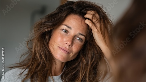 woman, mirror, beauty, hair, grace, serenity, peace, calmness, simplicity, femininity, calmness, inspiration, warmth, skin, personality, balance, smile, awareness, softness, confidence, expression, intimacy, charme, joy, mood, mindfulness, health, thoughtful, appearance, relaxation, elegance, happiness, grooming, emotion, connection, portrait, lifestyle, style, casual attire, nature, authenticity, morning, natural, closeup